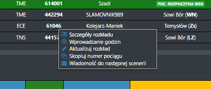 • Wiadomość do następnej scenerii - opcja pomocnicza kopiująca numer pociągu do schowka oraz otwierająca okno z wiadomością prywatną do kolejnego dyżurnego na trasie pociągu, np. w celu poinformowania go o odjeździe pociągu