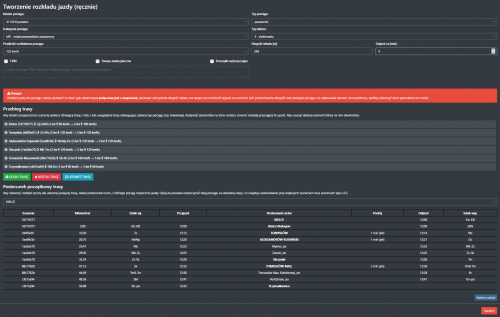 Po naciśnięciu przycisku “Generuj rozkład jazdy” i poprawnym uzupełnieniu danych (w przeciwnym przypadku pojawi się informacja z błędami, które należy poprawić) pojawi się 10 gotowych propozycji trasowań. Postaraj się dobrać taką propozycję, która nie przewiduje długich postojów (chyba, że maszynista zadeklarował chęć na takowe). Możesz również ręcznie edytować już gotowy rozkład jazdy z podanej listy i dołożyć do niego dodatkowe scenerie lub zmienić ich kolejność.
