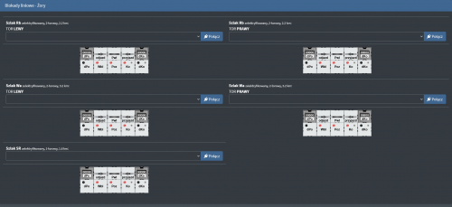 Każda sceneria posiada swój zestaw blokad liniowych dla szlaków zewnętrznych, po jednej dla każdego toru szlakowego. Dla szlaków dwutorowych, po lewej stronie wylistowane są blokady dla torów w kierunku przeciwnym do zasadniczego (“lewych”), natomiast po prawej dla torów w kierunku zasadniczym (“prawych”). Pamiętaj, że ruch kolejowy w Polsce jest prawostronny, a jazda po torze “lewym” odbywa się na specjalnych warunkach po uprzednim uzgodnieniu tego z dyżurnym ruchu kolejnej scenerii, do której wysyłasz pociąg. W przypadku szlaków jednotorowych nie istnieje rozróżnienie toru prawego i lewego.