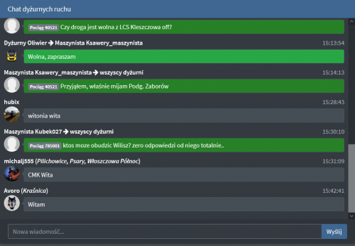 • Niebieski - wiadomości prywatne - widoczne tylko dla nadawcy i odbiorcy, wiadomości systemowe, np. zwolnienie blokady szlakowej, informacja o zbliżającym się końcu służby.