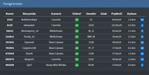 Tabela Pociągi w trasie zawiera listę aktywnych maszynistów na wybranym serwerze, razem z informacjami o kursującym numerze pociągu, prędkości, poziomie użytkownika oraz lokalizacji w danym regionie. Pociągi, które z jakiegoś powodu są offline (np. z powodu utraty połączenia internetowego) są oznaczone czerwonym krzyżykiem - użytkownik nie ma wtedy prawdopodobnie kontaktu z innymi uczestnikami ruchu.