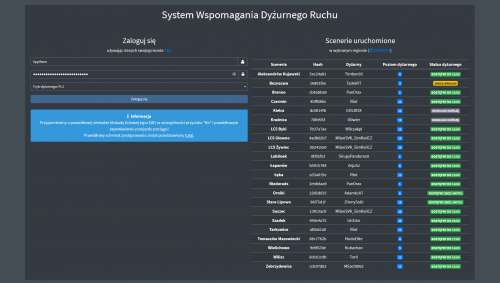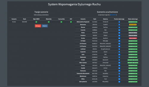 Po pomyślnym zalogowaniu się wybierając opcję “Tryb dyżurnego” pojawi się lista scenerii uruchomionych przez użytkownika. Jeśli uruchomiłeś scenerię i nie widać jej na liście “Twoje scenerie”, odczekaj chwilę i odśwież stronę, upewniając się, że sceneria jest również widoczna po prawej stronie na liście wszystkich użytkowników, a także wybrałeś dobry serwer oraz w kolumnie “Status dyżurnego” nie figuruje “NIEWPISANY” (w takim przypadku masz scenerię ze złym hashem - może być to spowodowane nowszą wersją scenerii bądź jej wycofaniem).