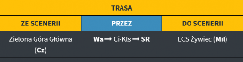 Przykładowo: z powyższego zrzutu możemy odczytać, że chcemy wysłać pociąg na nasz szlak SR, a docelową scenerią będzie LCS Żywiec i szlak Mil