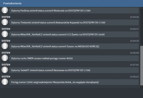 W oknie powiadomień pokazują się informacje systemowe dotyczące zmian statusów godzinowych dyżurnych ruchu, usuwania rozkładów jazdy oraz informacji o wykolejeniach.